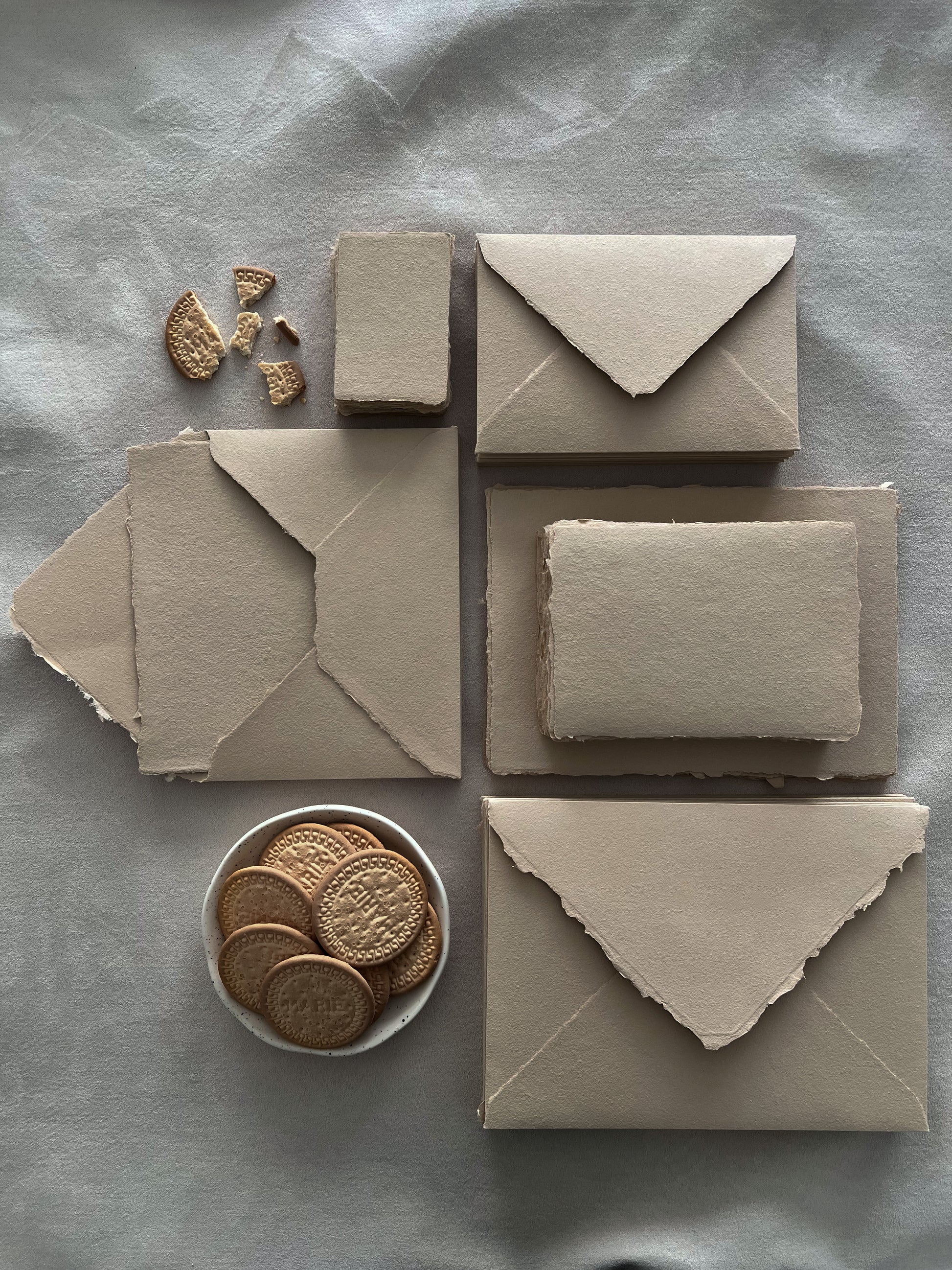 Every sheet and envelope is handmade. This means that no two items are exactly the same size with the same edges and the same weight. The tint may also vary from batch to batch, but we try our best to keep this as consistent as possible. To us, these irregularities are the beauty of handmade paper.