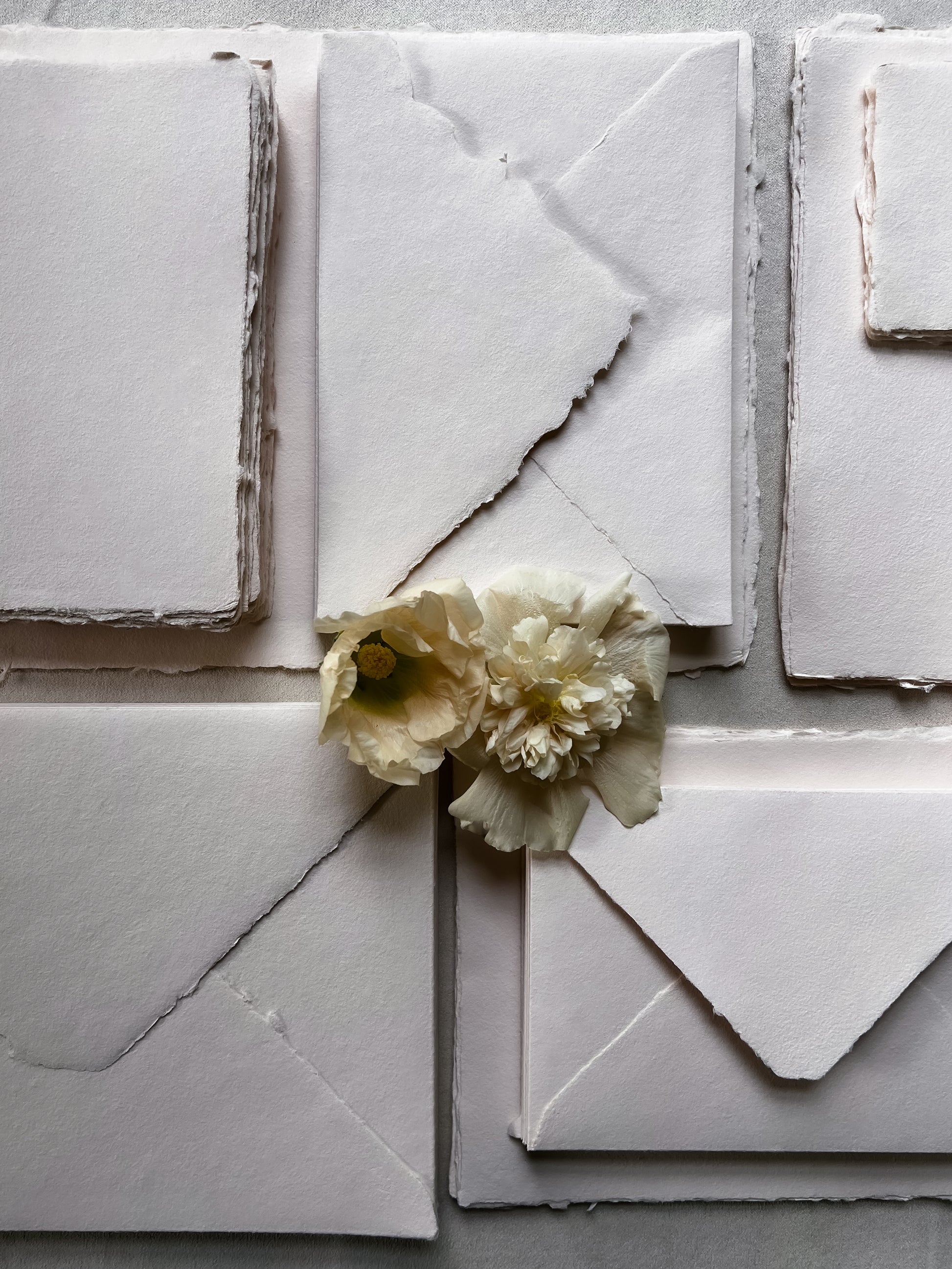 Every sheet and envelope is handmade. This means that no two items are exactly the same size with the same edges and the same weight. The tint may also vary from batch to batch, but we try our best to keep this as consistent as possible. To us, these irregularities are the beauty of handmade paper.